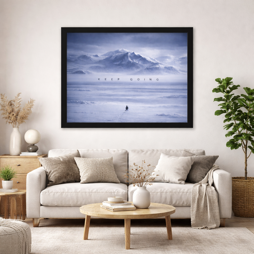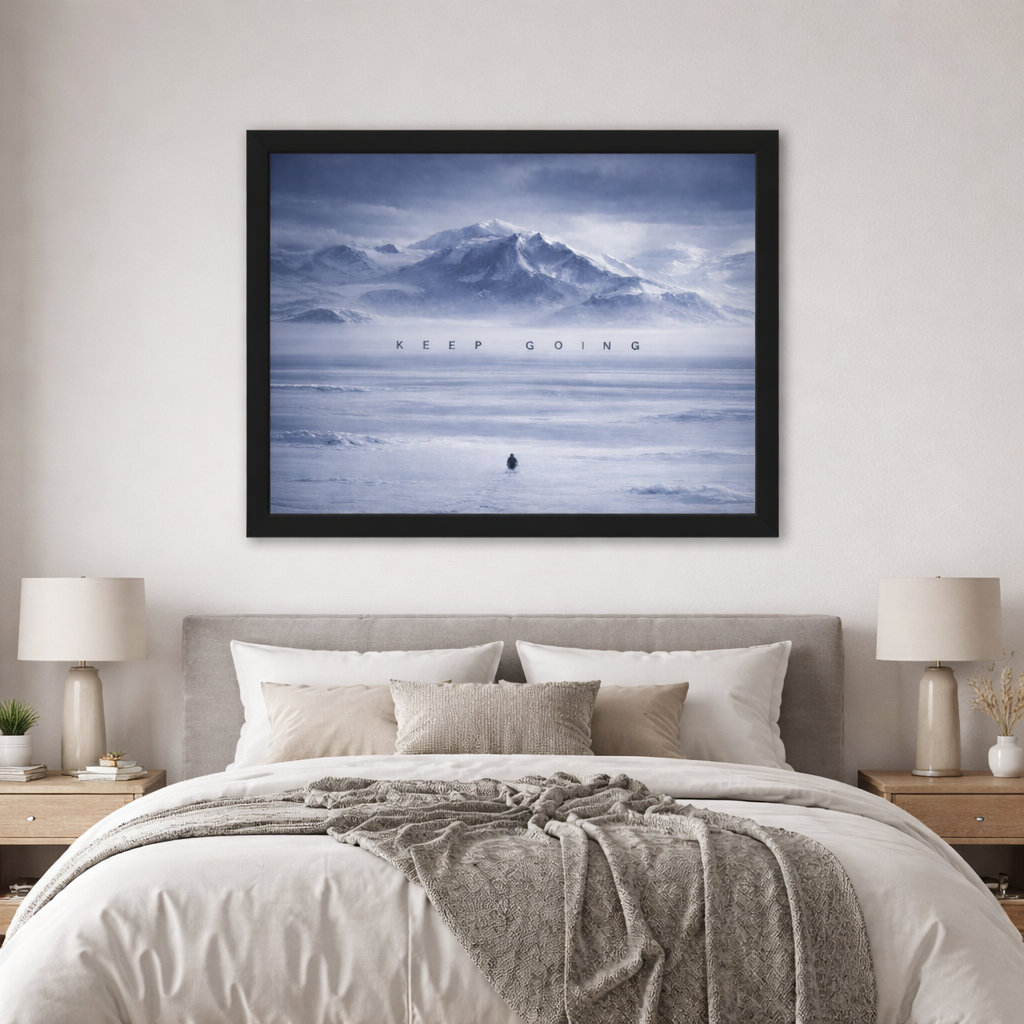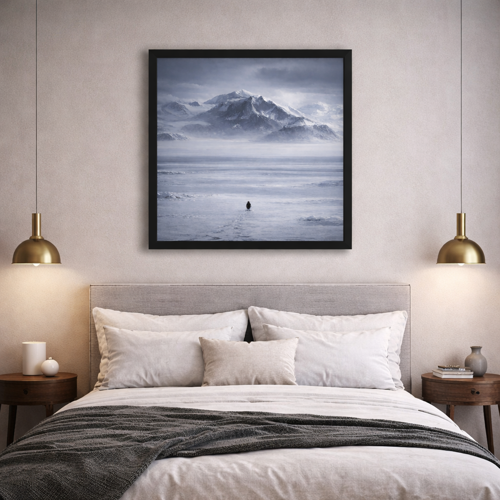 This serene yet dramatic composition captures the beauty of solitude and ambition. The vast icy terrain and distant mountains represent life’s challenges, while the solitary figure reflects unwavering commitment to progress.